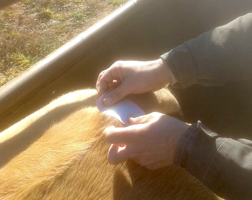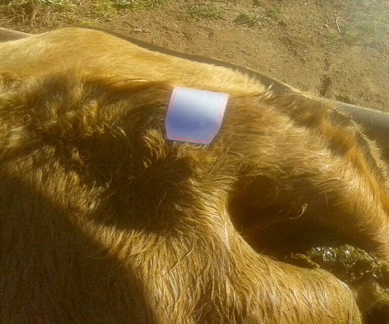 La etiqueta autoadhesiva se coloca en la zona sacra, entre las crestas ilíacas y el isquión.